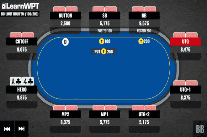 问题现在变成了是否按钮玩家的范围中有足够多的诈唬牌使得我们的跟注是有利可图的。通常而言,大多数对手不会用他们的锦标赛生命去对三个对手做纯诈唬。如果我们有这个牌手在类似这样的场合做诈唬的历史信息,那么我们或许可以考虑跟注。