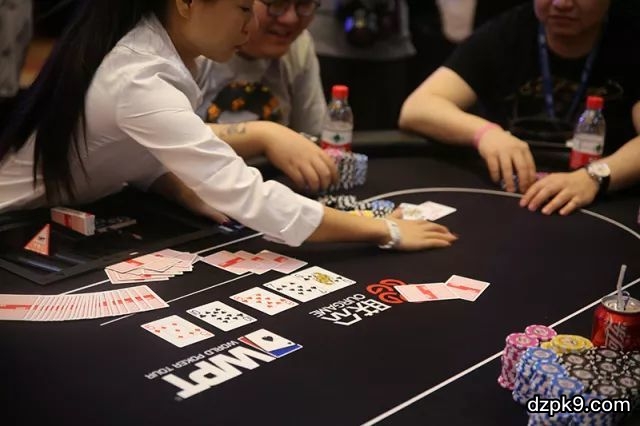 全桌惊呼,教练再次反超,短码玩家也是很无奈。现在他只有两张8的outs。