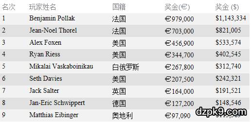 决赛桌上两位德国牌手Matthias Eibinger和Jan-Eric Schwippert先后出局,分别获得第九名和第八名。