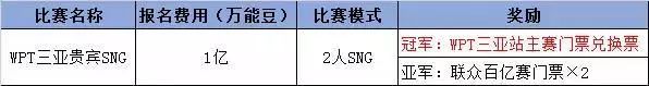 贵宾专属通道,为2人SNG,1亿万能豆报名,冠军获得WPT三亚站主赛门票兑换票,亚军获得2张联众百亿赛门票(每张价值1600万豆子),这也是最豪获取WPT三亚站主赛资格的方式。 /uploads/allimg/251204/0119302R8-6.jpg