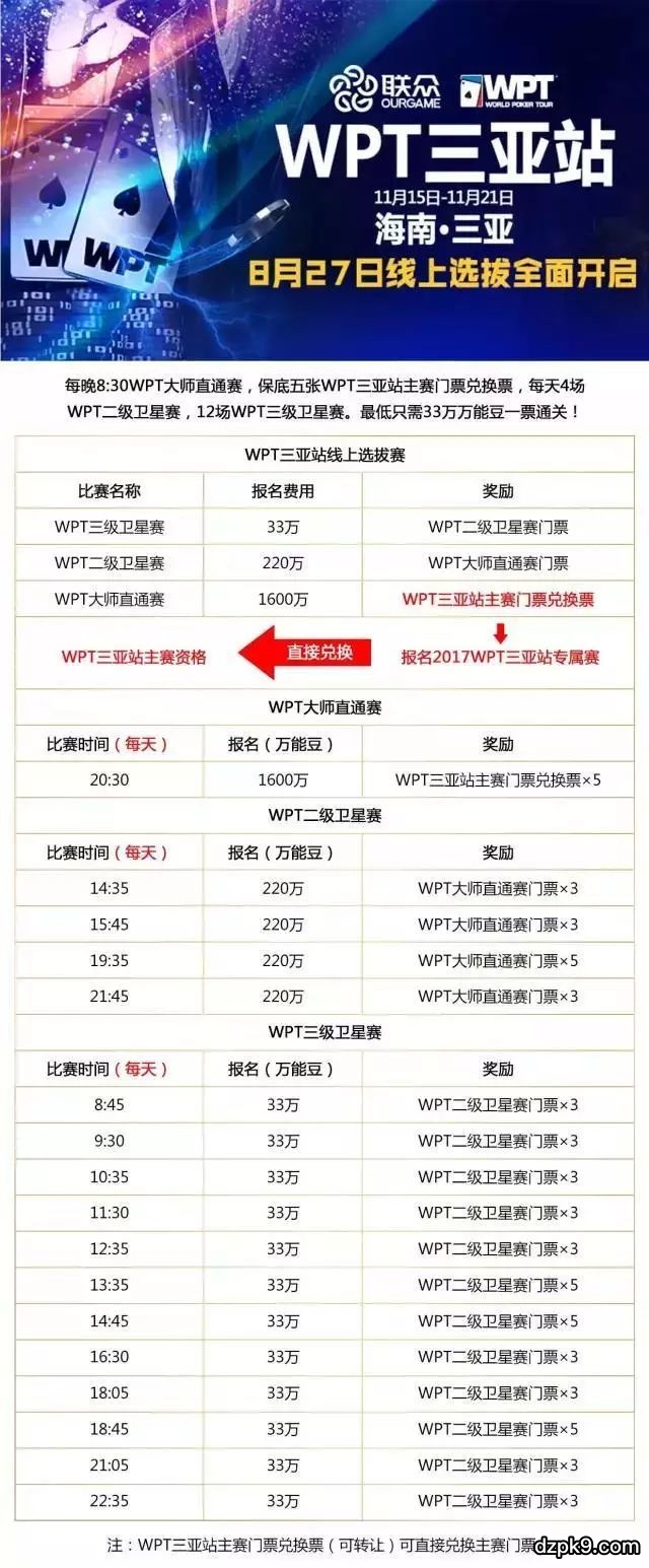 WPT三亚站主赛门票兑换票:虚拟门票,可转让,参与<2017WPT三亚站专属赛(SNG)>直接兑换——WPT三亚站主赛资格。