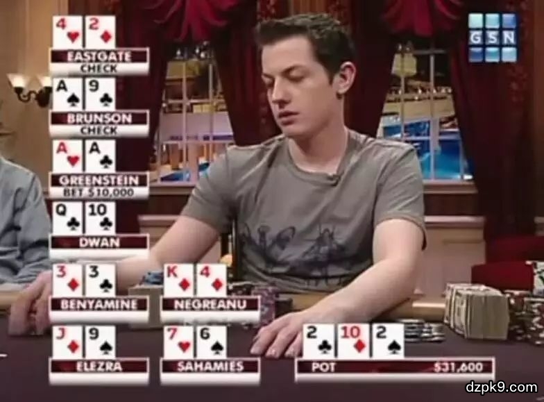 Eastgate和Brunson在两个盲注位过牌,Greenstein率先下注$10,000,可Dwan却直接加注到了$37,300。Benyamine、Elezra、Sahamies和Negreanu纷纷弃牌,Eastgate跟注,Brunson弃牌,Greenstein也跟注。