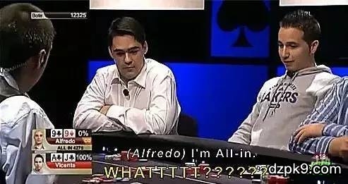 不知道他是怎么想的,但那个坐两位当事人中间的牌手又发话了:“他这么做,有拿99的可能哦”,anyway,听了旁人的话之后,Vicente依旧还是跟注了,当时就连解说员都觉得有些困惑,他说:“Hmmm......他丢不掉了,但我不是很理解...”