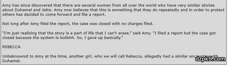 两周之后, ‘Amy’ 也向LVMPD当局提交了Duhamel涉嫌在拉斯维加斯强奸他人的报告,该报告得到了当时记者的证实。