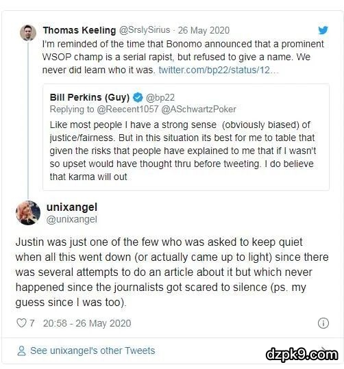 话题回到Thomas Keeling针对Duhamel的犯罪行为曝光之后,他说本周扑克之星就此事也和他联系。