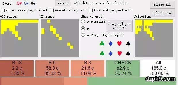在这样一个面,我们发现对手的cbet频率明显高于50%,比如高达75%以上,就意味着他咋呼的过多了,我们用更多的牌去加注他,他就难以抵抗。这个例子是为了说明,GTO策略的研究,为剥削打法设立了一个标准,任何偏离GTO标准的频率,在实战中如果被发现,都可以针对性的调整进行剥削。
