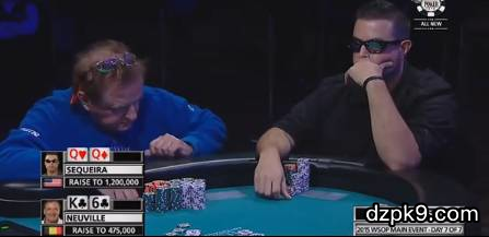 在这一次面对面的冲突中,Neuville后来居上。这手牌可以说为这位比利时老将扫清了通往决赛桌道路上的一切障碍。那么这一切究竟是如何发生的呢?到底Sequeira有没有避开被淘汰命运的可能呢?我们一同来分析一下。翻牌前,考虑到前面没人加注,Neuville的K♣6♣可以说是很不错的牌,足够支撑得起一个加注。/uploads/allimg/251204/01200424U-2.jpg