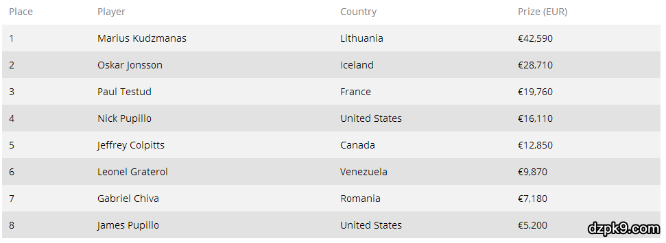 在决赛桌进行到第26级别结束时,本届EPT蒙特卡洛站边赛 €1,100 NLHE Freezeout迎来了它的新科冠军Marius Kudzmanas。来自立陶宛的Marius Kudzmanas在前天的决赛中以低于均码的筹码量开始比赛,虽说是短码开局,却也没能击垮他的坚韧的意志力,凭借着几轮翻倍,他很快就将筹码建立起来,尽管一度被打去一半筹码,可实力过人的他很快就把筹码赢回来,并一路将优势保持到最后,他在获得Spade冠军奖杯的同时,也拿下42,590欧元(47,545美元)的奖金,这场胜利让他的现场锦标赛奖金超过200,000美元。