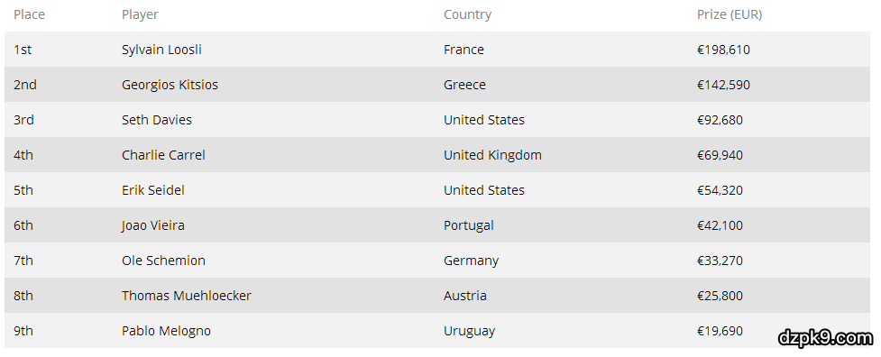 回顾赛事,本次€10,300欧元豪客赛一共吸引70名顶尖高手前来应战,包括Erik Seidel,Alex Foxen,Isaac Haxton,Matthias Eibinger,Ole Schemion和Ben Heath,Hiroyuki Noda,其中,Erik Seidel更是以Day1筹码王的身份强势晋级次轮,一路势如破竹踏进决赛桌的他却遗憾的倒在了第五名,而德国人Ole Schemion则取得第七名。