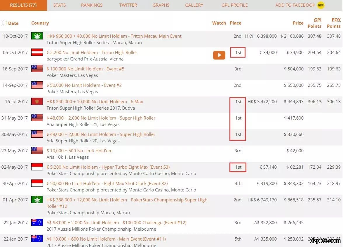 如今的他职业线下累计奖金超过2600万美元,在全球扑克金钱榜上位于第六名。