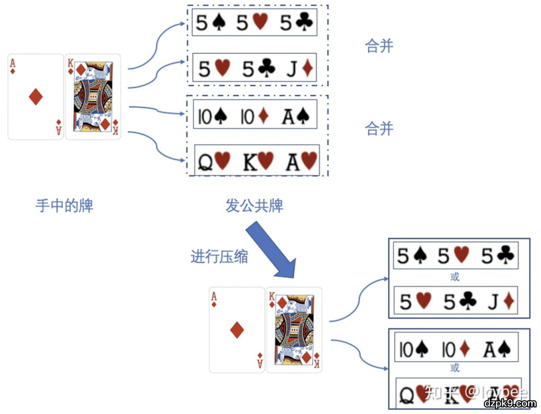 另外在德州扑克的翻牌(flop),转牌(turn)以及河牌(river)都需要发公共牌,发牌的可能性也很多,这里就又可以把发出来的公共牌进行合并,比如下图的情况,我们(例如在preflop结束发公共牌的时候)认为在拿到AK的时候,公共牌是555还是55J差不多,于是就可以把这两种公共牌看作是同一种情况: