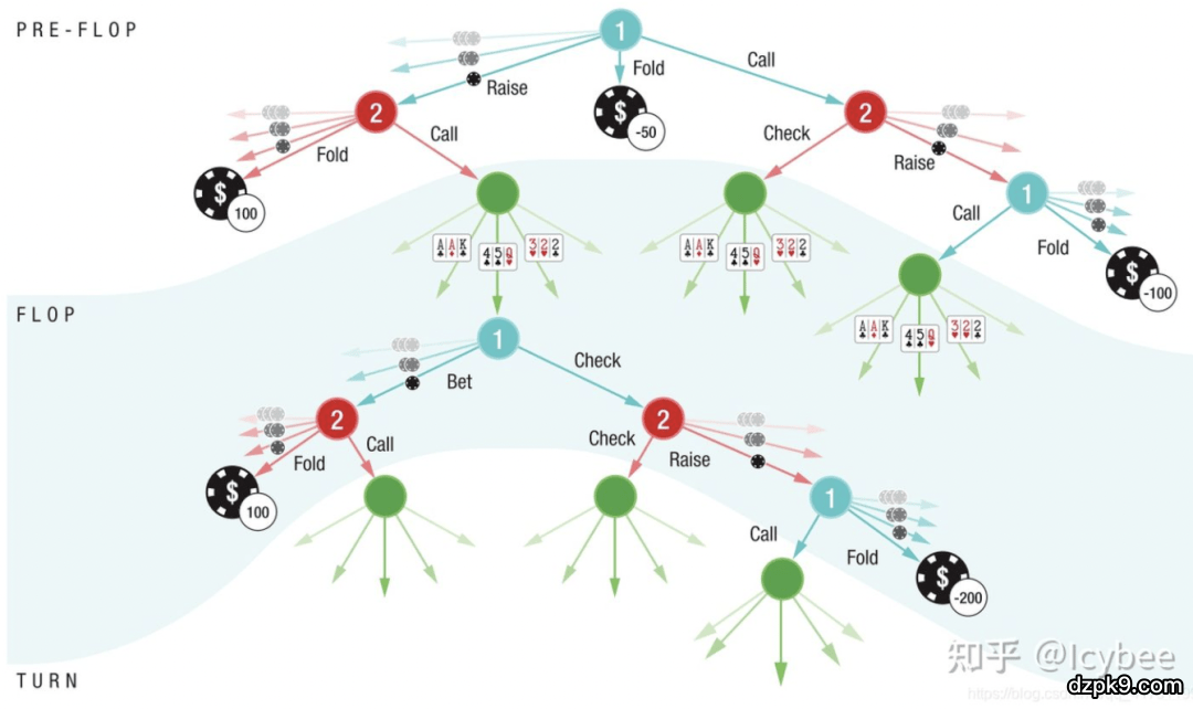 好了,有趣的广告时间结束了,让我们进入无聊的正题。德州扑克的ai我认为是在所有当前的ai研究中极为特殊的一个:德州AI的思路有非常多,而且都可以达到至少还不错的水准(比如一直风靡扑克竞技玩家圈的CFR(Counterfactual Regret Minimization) 算法,CFR算法的超级魔改版本“冷扑”Libratus[1],使用了深度神经网络的deepstack[2],fictitious play[9], 使用了deeplearning+自对弈的poker CNN[10],还有种种其他算法)。与之相对比起来,dota,星际,象棋,围棋当前的主流AI方法都没有这么多,思路也没有这么开阔。对于德州扑克来说,这是一个群星璀璨,百家争鸣的时代。
