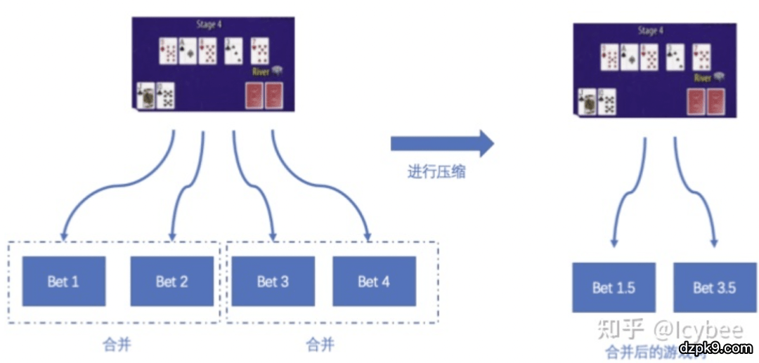 由于无限注德州扑克中,下注的可能性太多,可以通过合并一些下注的方式,比如,在某个场景下,比如我们有四种下注方式,可通过将这四种下注方式两两合并的方法来减少树的大小: