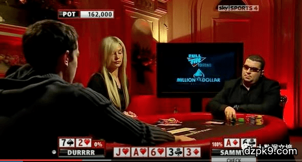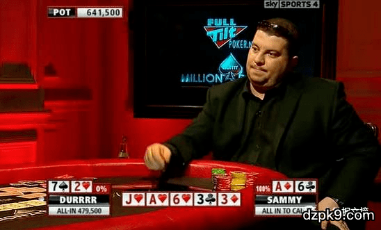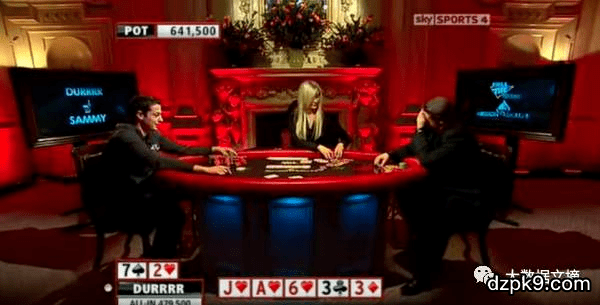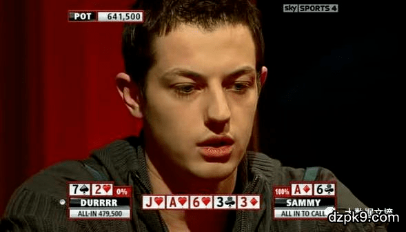 (Sammy: 呃... ... 虽然我有2对,其实我只能赢一个bluff。真的有人敢在这么危险的牌面上推出来一个超pot all in吗? 看来我只能good fold了)