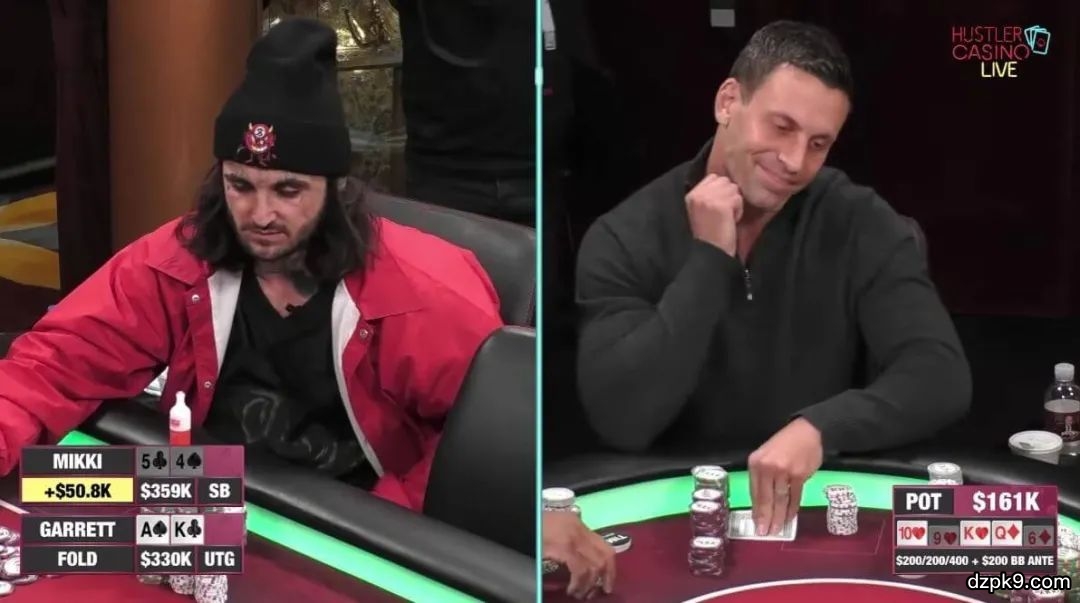 今天的这手牌选自不久前Hustler Casino举办的NL$200/$400高额常规桌游戏,一众大牌玩家如Phil Ivey,Tom Dwan,Matt Berkey和Garrett Adelstein都有参加。他们进行的是6人桌游戏,有效筹码深达770BB。在这首牌发生前,现场常规桌大神Garrett Adelstein筹码略多于高额玩家Mikki。Garrett在枪口位用A♠K♣加注到$1,200,小盲位的Mikki用5♣4♠做了一个很松的3-bet到$4,000。行动回到Garrett,他再加注到$15,000,令人惊讶的是,Mikki很快地选择跟注。因此,在翻牌前底池就已经达到$38,000。牌面很湿润。Mikki领先下注$15,000,Garrett顶对顶踢脚仅仅选择跟注。底池大小:$60,800。一张很有意思的牌,这张惊悚牌让牌面一张成顺。Mikki继续开火$20,000(1/3底池),Garrett再次跟注。底池大小:$101,000。这是一张空白牌。Mikki依旧是空气,但他选择诈唬到底,往$101,000底池中打了$60,000。Garrett思考超过两分半钟,最终选择弃牌,而Mikki也亮出了自己的5-high,后者疯狂的三条街诈唬赢下了$161,000底池。Garrett在枪口位用AKo加注是很标准的,而小盲位的Mikki用54o(o代表off suit,指不同花色)做3-bet则显然不是!这是非常松且危险的玩法,因为整首牌你将在没有位置的情况下对抗一个强劲的对手。Garrett在意料之中选择再加注,但是Mikki决定跟注看一下翻牌后。