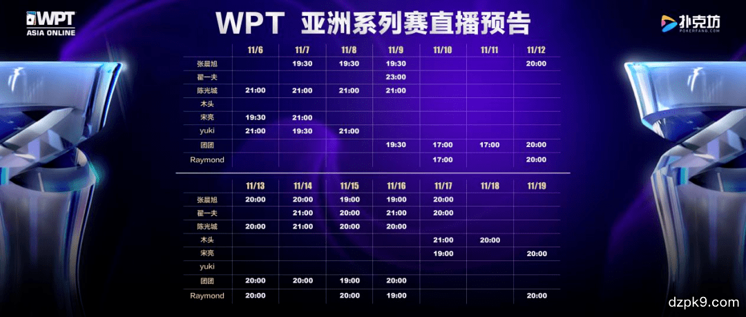 群星闪耀的WPT亚洲巡回赛,赛事直播自然不能缺席,从11月6日开始扑克坊将全程直播WPT亚洲巡回赛及其卫星赛!