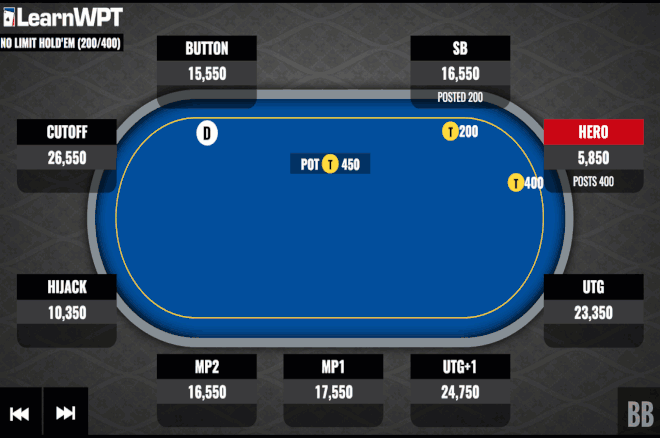在劫位玩家加注和按钮玩家跟注后,轮到我们拿着AJ在大盲位置行动。因为只有约15个大盲注,我们有一个非常适合全压的筹码量。因为我们有足够多的筹码来制造弃牌赢率,而且我们没有给我们带来糟糕的风险回报率的太多筹码,筹码量在10-20bb之间允许我们翻前极高效地再加注到全压。