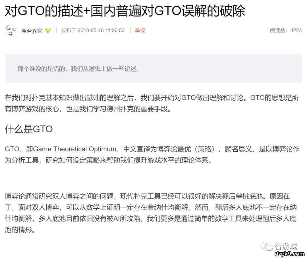 事情的起因是这样的:前天@郭东FT 在一个群里发了一个链接,并好心提醒对GTO感兴趣的@王小山 去看看。我点了链接,发现这是我2015年在智游城和扑士杂志上发表的文章。郭东要我给出原文链接重发,我说不用了,毕竟智游城文章被盗用的太频繁,很多时候我甚至没有好奇心问盗用者是谁。这事就算过去了。