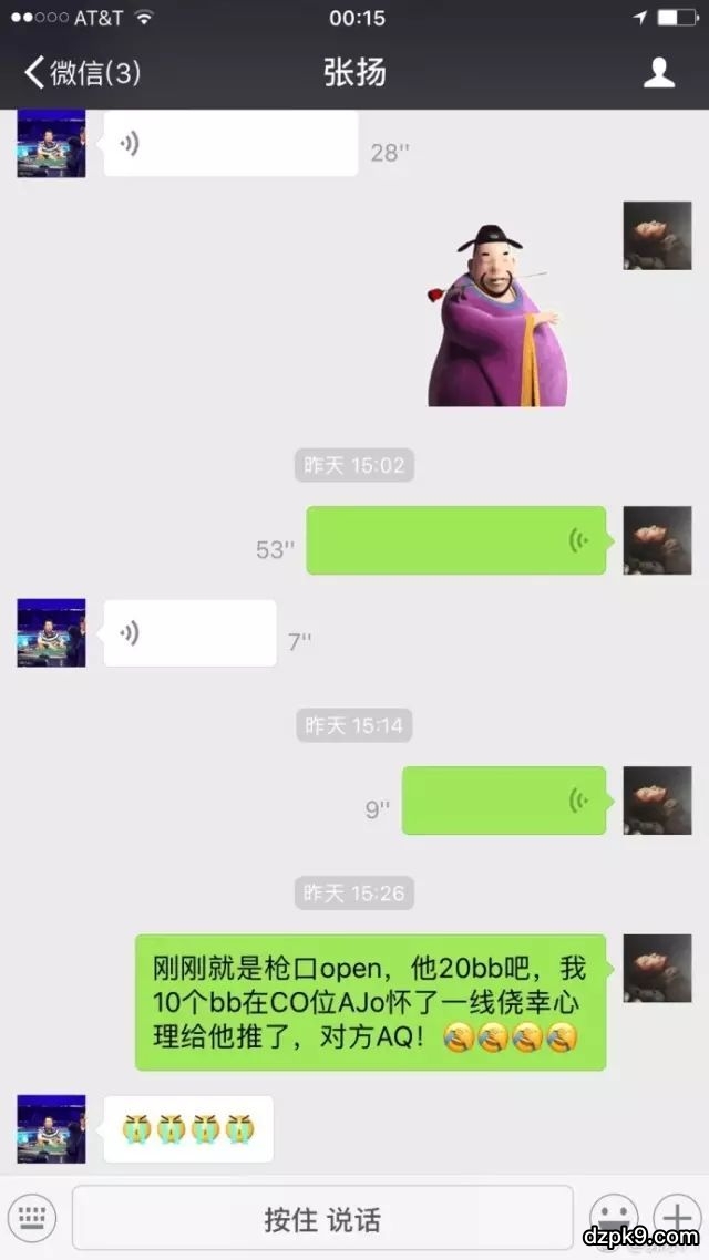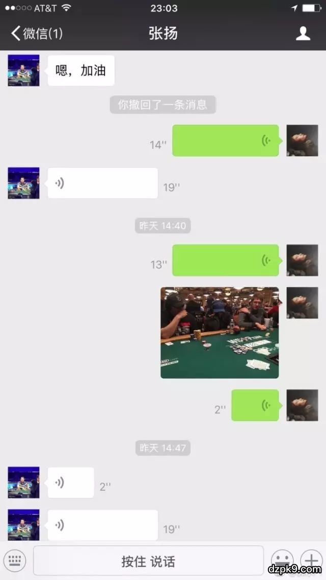 今天我们不聊比赛过程,也不讲解牌局,给大家分享一段我和张阳的微信聊天内容,我觉得这个东西或许对大家有用,把语音转换成文字笑死我了,还得手动把语音给转成文字,我容易吗我!