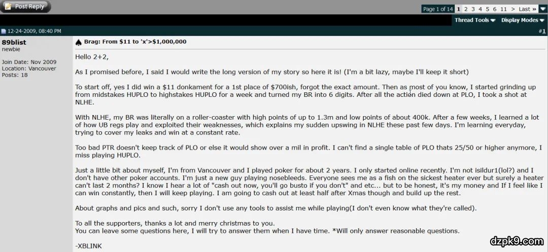 我们来看看这位大神2009年在2+2论坛上一条“自我介绍”的帖子: