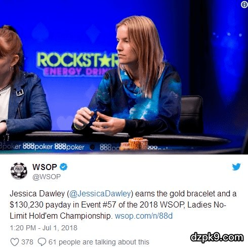 虽然Dawley只打入了今年WSOP一场赛事的钱圈,但她却是在这场赛事钱圈中拿到最大一笔奖金的人,DawLey拿到的是今年女士赛的冠军奖励,奖金130,230美元,这也是她获得的个人第一条金手链。