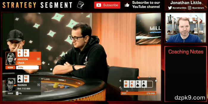 我们试图让Qx牌弃牌,那么我们要下注多大呢?这是Kemple应该问自己的问题。注意到Rainer的范围有许多想在河牌圈价值下注的牌很重要。