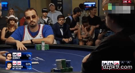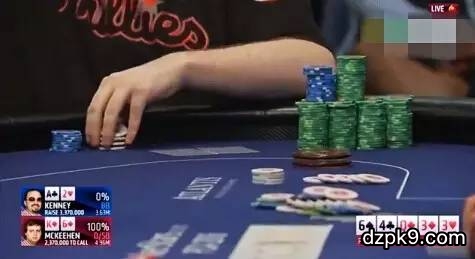 McKeehen足足思考了近一分钟时间,他紧紧盯住对手,并最终决定跟注。Kenney无奈亮出A♣2♥,诈唬被揭穿。
