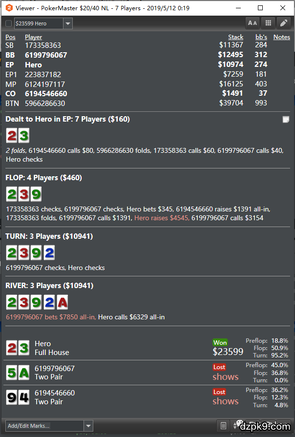 所有的这些能力中,建立社交网络的能力在我看来其实是最重要的一个。如果你在一个好的扑克社交网络中,你可以获得更多的资金支持,有更多的优质朋友局可以参与,同时也能获得更先进的知识和理念来帮助你快速学习。有研究(或者名言/谣言)表明,一个人在各自领域里的水平大致是其身边6个最亲密的人的平均水平。我的经验是这个效应在扑克领域里尤其显著。Fedor Holz在Poker Mind Academy的采访中提到,他觉得自己成功最重要的优势在于自己身处一个最顶尖的活跃德语牌手的社交群体中。这个群体一起讨论研究最前沿的战术理论,一起参加世界上最大的豪客赛,这使得德国牌手在过去的五年中一直处在世界牌坛的顶尖位置。而聊牌这个扑克圈里最最基本的社交行为,是你能融入一个高水平扑克社交圈的基础。理性,诚实,言之有物,能提出有建设性的意见和问题,这样的伙伴在任何一个小圈子都会受到欢迎。但这一点又很难做到,由于扑克环境的原因,扑克圈的人口素质并非出类拔萃。很多的人聊牌的过程中,一是说不清楚牌局细节,让人很难给出有效的反馈;二是放不下过分的自尊来交流意见,导致交流情绪化。所以我今天主要从聊牌的表达方法和心态两方面来谈谈我的体会和感受。当时剩10个人,再掉一个进FT了,我筹码第三。前面一哥们儿open,我在btn一看JJ,我当时就感觉不好,JJ这牌特容易出事儿。我就没3-bet他,只call了一手。结果大盲的鱼直接推了50个BB。其实我call的时候就觉得这鱼可能要搞事情,他前面这种事儿弄了好几次了,我要是提前3-bet了就没这些事儿了。我以前比赛拿JJ跟人跑马老是输。这手我知道丫没牌,最多就是AK,但是这边FT泡沫了,pay jump又大,我不是很想跑马。这里要搁别的时候我都滴答call了,这边儿我有点怂了就盖了。丫秀了一A给我看,我就知道丫是AK。相信大家看完这段描述之后应该都有一种很熟悉的感觉,这样的牌局描述时时刻刻出现在大家耳边。如果仅仅是要宣泄自己的情绪,那么无论你怎么样说都无可厚非。但是如果你希望通过讲述一手牌来获得对方对这手牌处理的评价或者意见,那么这种描述就有很多的问题。每一手牌,尤其是那些你需要和人讨论的大底池,除了桌上的决策,还都有着牌手间激烈的情绪碰撞。一手牌结束后,我们的大脑会去合理化我们所作出的决策,使得我们的认知达到协调,而这无形中掩盖了帮助我们做出理性判断的细节。所以我们在描述牌局时应该专注在客观的事实上,而不要带入太多的主观判断。举个例子,经常我们会听到“我的对手翻后非常凶“,这其实本身也是一个主观判断,我会尝试用客观的事实来代替,比如”他翻后AF 4.5“,或者”他在flop上几乎100%的进行c-bet“等。再比如前面我朋友对于手牌的描述中,有着大量无用的主观的偏见,比如“JJ这牌特容易出事儿“和”我JJ跟人跑马老是输“等等,理性来讲其实都是幸存者偏差导致的错误归因。作为一个牌手,我们需要理性的认知这个世界和牌局的波动。我遇到很多朋友跟我咨询一手牌的想法,但并不是所有人都能把所有的信息一次性的一目了然的摆在我面前,大多数时候我都需要反复追问其中决策所需的细节。每一手牌的决策都需要参考大量的信息,如果其中一些信息缺失,做出的决策很可能就会南辕北辙。■ 双方的位置每一条街下注的尺度双方的后手深度和底池大小比如在最初的例子中,这位朋友并没有告诉我最早加注进池的人是在什么位置,对手在枪口加注和在CO位加注的范围不同,会使我们做出的决策也不同。同时他也没有提供自己的筹码量,我们不知道大盲和我们筹码之间的差距,也会对我们的决策造成很大的影响。建议大家在描述之前,大家可以自己先梳理一下手牌过程,把过程和其中的细节整理清楚。这样对方可以很轻松的获得所需的信息,而不是听的云里雾里帮你去寻找信息。XX边赛5K买入,还剩10人FT泡沫期,pay jump很大,我筹码全场第三,CO位open 2BB,后手25bb。我在BTN拿到JJ跟注,后手47BB。大盲全场第二长筹码全下50BB,对手前面类似的动作做个两次。CO fold牌,我认为对手牌力并不是最顶尖的牌力,AK封顶,不然不会直接推,但是考虑到ICM压力我不想跑马这里盖牌了。大盲秀了一张A。这牌你怎么看?还有一个小技巧,如果大家是在线上打牌,可以直接通过app或者HM2数据库贴出完整的牌局记录。这种牌局记录往往既包含了绝大部分有用的信息,同时又条理清晰,是讨论手牌中非常有用的工具。