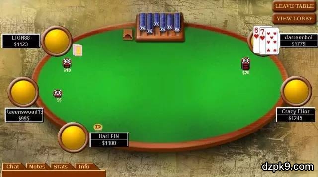 对手是一个打得紧,不擅长读牌,只会看着自己的底牌打的玩家▼翻牌是K♥5♥2♣,我有一个同花听牌,对手过牌,我为了弃牌率选择下注,对手跟注。我判断他有个对子,或者也是一手同花听牌,如果对手有三条以上的牌可能会跟一次,但大部分时候再加回来。转牌是一张8♣,让我形成了同花加两头顺听牌,对手继续过牌,我还选择继续下注,对手还是跟注,这时候对手的牌力依旧没有改变,仍然可能是对子和同花听牌。河牌是一张2♠,我错过了所有听牌,但这时候对手继续过牌,我很清楚我这手牌摊牌必输无疑,所以这里我要偷他一锅▼我脑海里飞速计算对方的范围,对手跟注到河牌的牌包括了很多带K的牌,比如KQ,KJ,KT,但由于对手在盲注位打得比较紧,所以我判断他底牌范围里只包括所有的带K的同花牌。那么这里可能的手牌有K♣Q♣,K♦Q♦、K♠Q♠、K♣J♣、K♦J♦、K♠J♠、K♣T♣、K♦T♦、K♠T♠、K♣9♣、K♦9♦、K♠9♠,一共12种组合。同时对手也会跟注一些同花听牌,基于上面同样的判断,我估计他范围里可能的组合有Q♥J♥、Q♥T♥、Q♥9♥、J♥T♥、J♥9♥、T♥9♥、9♥8♥这些同花听牌,一共7种。