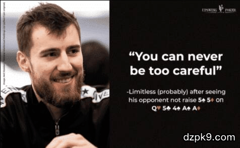 如果对手是个频繁在各种场合超额下注的疯狂诈唬者,只是用暗三条跟注可能是合理的。但我严重怀疑这种可能性,因为对手是Limitless,一个高侵略性但精于计算、从不犯大错误的牌手。