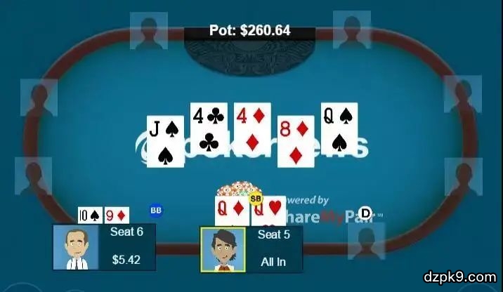 翻牌是J♠ 4♣ 4♦,两名牌手都check。转牌是8♦,小盲玩家往6美元的底池下注4.5美元,大盲玩家跟注。