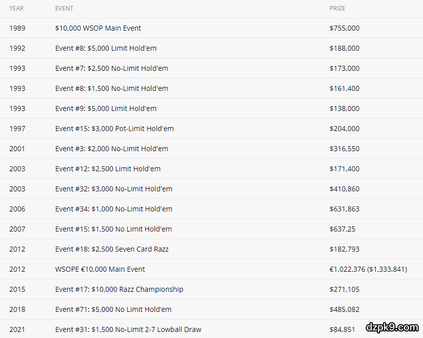 WSOP金手链第一人,他将记录扩大到令人难以置信的 16 条。他的第一条金手链是在1989年主赛事上获得,当时他成为历史上最年轻的获胜者。下面是他16条金手链的记录:
