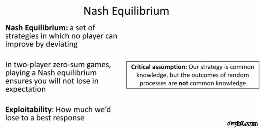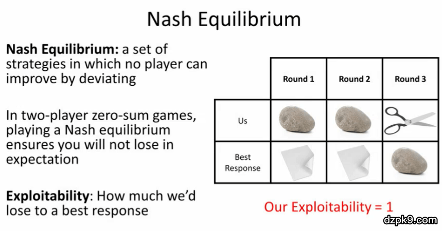 首先,纳什均衡指的是在某组策略下形成的一种局面:没有人能够通过改变自己的策略改善自己的收益。在二元零和博弈中,形成纳什均衡可以保证无论我们的对手如何行动,从期望上说,我们都不会输掉。此外,可利用性(exploitability)指的是:我们的结局比最佳对策差多少(即如果对手完美地反击了我们,从期望上说,我们将会输多少)。