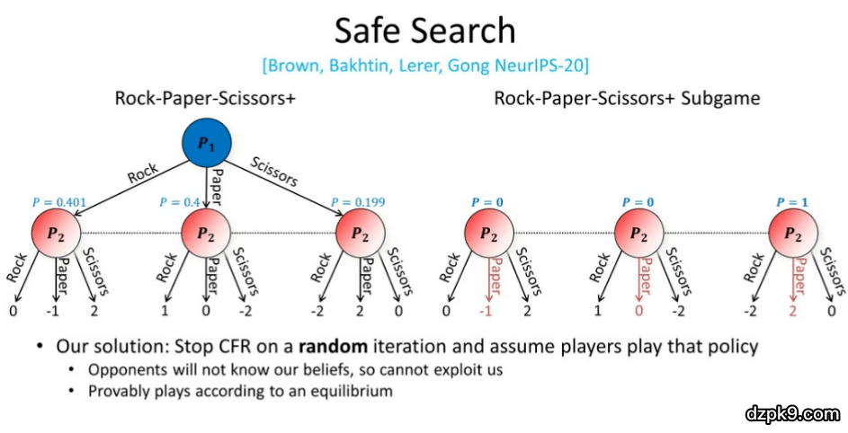 为了解决上述问题,研究人员撰写了许多论文探究解决方案。但是我们最近于 NeurIPS 2020 上发表的方法是目前最有效的技术,它对我们所处状态的信念进行了随机化处理。其中,我们通过 CFR 算法判断对手的策略,而不是假设对手处于纳什均衡。此外,我们经过随机轮次的迭代后会终止算法,而不是将算法迭代固定数量的轮次。我们假设玩家的策略来源于这种随机迭代的过程,由于我们从一个随机的迭代过程中采样,对手就无法知道我们怎样对它们的策略进行假设,他们就无法利用我们的信念。根据纳什均衡,我们证明了这种有关信念的假设在理论上是合理的。
