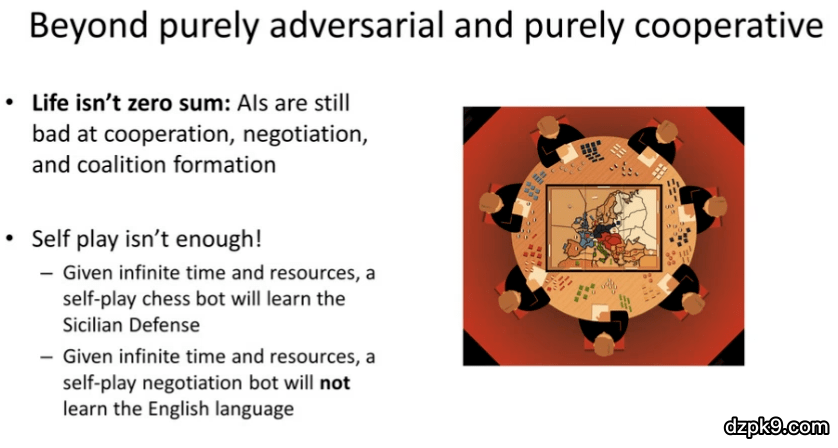最后,我们将讨论比纯粹的对抗和纯粹的合作更复杂的情况。在现实生活中,往往并不存在这种零和博弈的情况。人工智能系统在协作、谈判、联盟等场景下仍然表现不佳。在这些博弈问题中,人工智能与自己进行对弈是远远不够的。假设我们拥有无限的时间和资源,通过自我博弈训练处的国际象棋智能体最终会学习到西西里防御。但是即使拥有无限的时间和资源,通过自我博弈训练的谈判智能体也无法学会说英语。如果我们想要在这些场景下取得成功,我们需要智能体能与人类交互,或收集人类的数据。