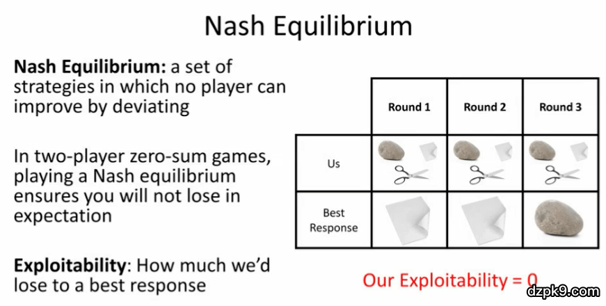 在这种情况下,你可能会认为,从期望上说我们并不会输,不会被「利用」。但是,在形成纳什均衡的局面后,我们也不会赢。在「石头、剪刀、布」游戏中,这种想法是成立的。