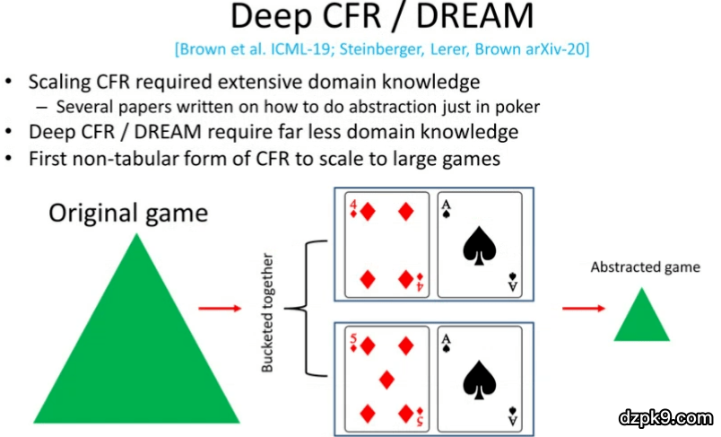 基于深度学习的 CFR(Deep CFR)/DREAM 算法是另一个令人激动的领域。它们是 CFR 的非扁平版本。为了将原始的 CFR 算法扩展到超大规模的博弈(如「无限制德州扑克」)中,我们需要使用一种名为「抽象」的技术。「抽象」背后的思想是,在博弈中将多个相似决策点合并起来同等地处理,而不是在每个决策点上考虑每个动作的遗憾值。例如,扑克中的两种同花顺「queen high flush」和「king high flush」将会拥有各自而定遗憾值,而在使用「抽象」技术后,我们会将二者放在一起同等地处理。因此,在使用了「抽象」技术之后,我们可以将合并起来的决策点一同更新,而不需要分别更新这些不同情况下的决策点。「抽象」技术对于扑克游戏十分有效。而想要将该技术拓展到其它领域也很困难。实际上,已经有许多研究者撰文讨论如何在扑克领域进行「抽象」。