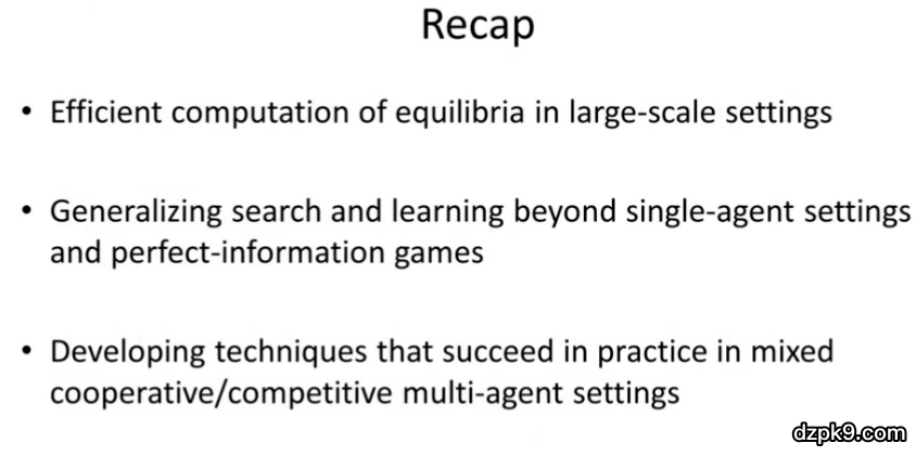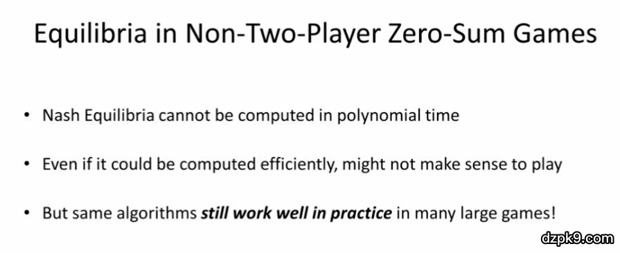 接下来,我们将讨论非二元零和博弈中的均衡。此时,我们无法在多项式时间内计算出纳什均衡。即使我们可以高效地计算出纳什均衡,这么做也没有意义。这是因为在非二元零和博弈中,一些纳什均衡的优秀性质(例如,从期望上说,我们不会输掉)就不复存在了。然而,本次演讲中提到的算法在这种情况下效果仍然很好。这些算法在实际情况下通用性如何仍然是个有待研究的问题。