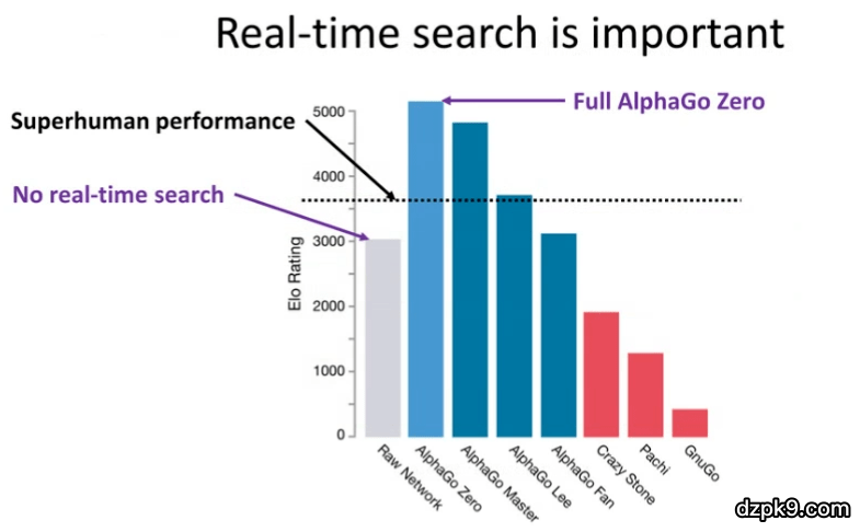 首先,搜索不仅仅对于非完美信息博弈十分重要,对于完美信息博弈也是如此。在图 16 中,y 轴代表了 Elo 等级分,它衡量了人类棋手和机器的表现。在围棋中,表现为「superhuman」的阈值被设定为 3,600 Elo。如图 16 所示,浅蓝色的竖线代表 AlphaGo Zero 的性能,显然其性能达到了「superhuman」水平。但是,如果我们去除掉测试时(甚至不用取出训练时)使用的实时搜索技术(本例中为蒙特卡洛树搜索),该系统的性能将会下降至灰色竖线所示的情况(大约 3000 Elo 等级分),而这并没有达到「superhuman」水平。这说明搜索对于围棋游戏是十分重要的。实际上,搜索的重要性不仅仅局限于围棋,它几乎对所有的游戏(例如,国际象棋、扑克)都很重要。