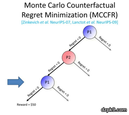 如图 9 所示,我们将遍历玩家 1(P1)的博弈树,在下一轮迭代中我们将转而考虑玩家 2,接着再考虑玩家 1......如此循环往复。玩家会一直在每个决策点上为博弈中的每个动作维护一个被称为遗憾值(regret value)的指标。在每次需要做出动作时,玩家会选择动作的概率与正向遗憾值成正比。遗憾(regret)值对应于玩家有多么后悔在之前的情况下没有采取某个动作。在第一轮中,所有的遗憾值都为 0。