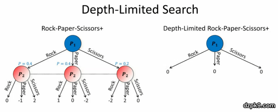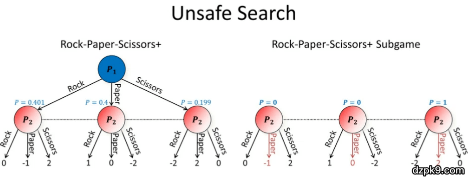 为了更简单地说明该问题,我们假设逼近了纳什均衡,但是并没有完美地达到纳什均衡。我们实现了玩家 1 的近似纳什均衡,他有 40.1% 的概率出石头,有 19.9% 的概率出剪刀,40% 的概率出布。现在轮到我们(玩家 2)出招。此时,我们的最优策略为以 100% 的概率出布。但是问题是,如果我们这么做,我们的对手在知晓了我们的算法后,可以通过从纳什均衡状态转变为总是出剪刀来对抗我们。这会使我们得到 -2 的值。因此,假设对手处于纳什均衡是一种「不保险」的搜索策略,因为对手可以利用我们这种假设。