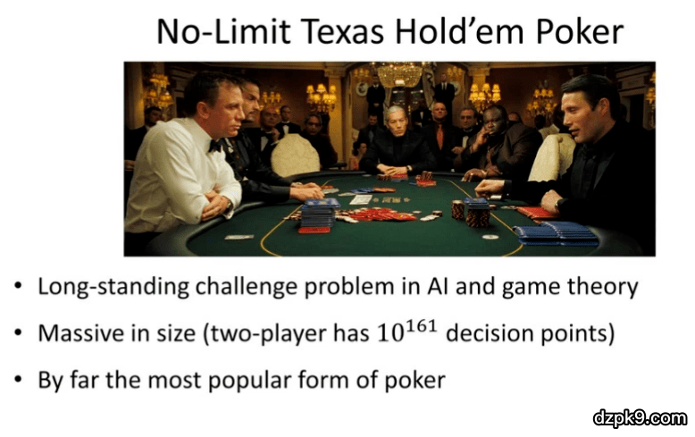 长期以来,扑克都是博弈论领域中的一项极具挑战性的问题。具体而言,「无限制德州扑克」是其中的一种变体。实际上,早在上世纪 40、50 年代,博弈论领域就有人撰写论文来研究扑克。而扑克也是一种大规模博弈,在「无限制德州扑克」中,博弈双方拥有 10^161 个决策点。到目前为止,「无限制德州扑克」是世界上最流行的一种扑克游戏。在各种有关扑克的电影(如图 3 所示的电影《007 大战皇家娱乐场》)中都有「无限制德州扑克」的身影。每年的扑克世界巡回锦标赛也都会举办有关「无限制德州扑克」的比赛。