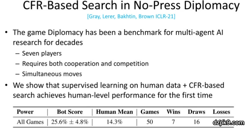 多年来,「外交」游戏已经成为了多智能体研究领域的常用对比基准,它是一种 7 人博弈游戏,玩家之间同时需要进行合作和竞争,涉及同时行动的博弈。近年来,人工智能领域有多篇论文涉及「外交」游戏。在我们 ICLR 2021 上发表的研究「外交」游戏的论文中,我们使用与前文所述的方法相类似的技术,通过基于 CFR 的搜索和使用人类数据的监督学习首次实现了与人类相当的性能。这说明,我们在本次演讲中介绍的相关思想不仅仅局限于二元博弈或对抗博弈,它可以被扩展当更广阔的场景下。https://www.moshike.com/