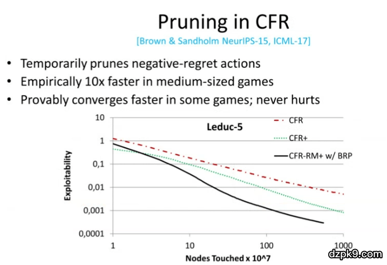 如图 13 所示,在中型扑克游戏 Leduc-5 中,y 轴代表可利用性(我们距离纳什均衡有多远),我们希望可利用性的值下降。另一方面,x 轴代表我们已经考虑过的决策点。红色的虚线代表原始版本的 CFR,绿色虚线代表 CFR 的一个改进版(CFR +),黑色的实线代表使用了基于遗憾值的剪枝策略的 CFR。可以看到,我们改进后的算法将收敛速度提升了一个数量级。