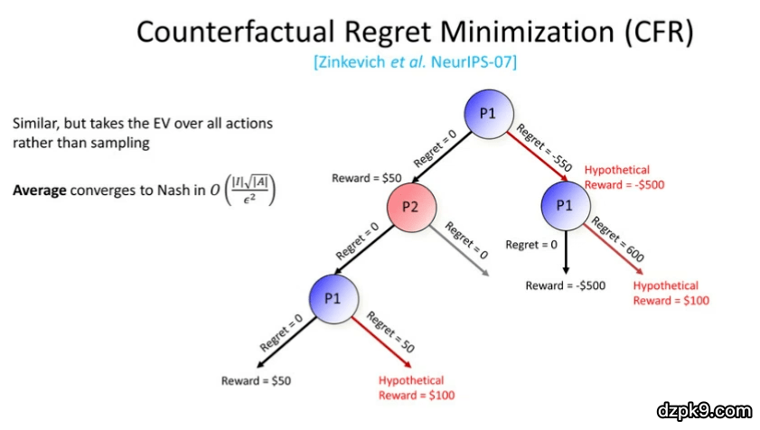 至此,我们介绍了 CFR 算法的蒙特卡洛版本。而 CFR 算法的非蒙特卡洛版本工作原理与前者相类似,只不过我们需要对所有的动作取期望值,而不是对它们进行采样。在所有迭代后得到的平均值将会收敛到纳什均衡。