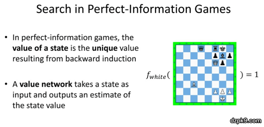 不完美信息博弈中的搜索比完美信息博弈中的搜索要困难得多。为了解释这一点,我们首先将介绍搜索在完美信息博弈中的工作原理,其中「值函数」是核心的概念。在完美信息博弈中,某个状态的值是反向归纳得到的唯一值。而值网络则以某个状态作为输入,并且输出对于状态值的估计。如图 17 所示,在国际象棋棋盘中,如果白方用其皇后吃掉黑方的象,然后就会「将军」,此时白方该状态的值为「1」。因此,如果我们将此时棋盘的状态赋到值函数中作为输入,值函数会返回白方的值为「1」。