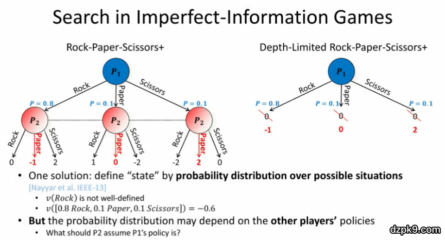 非完全信息博弈中的搜索更加困难,这是因为在非完美信息博弈中,并没有像在完美信息博弈中那样为传统的「状态」很好地定义「值」,这会导致现有的搜索技术失效。