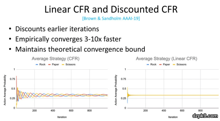 线性 CFR 和折扣化 CFR 背后的思想是降低较早的迭代的影响,这样可以维持 CFR理论上的收敛界(尽管实际上收敛的要快一些)。以图 12 左侧为例,我们给出了「石头、剪刀、布」游戏中的收敛情况。可以看出,CFR 策略给出石头、剪刀、布的概率会逐渐收敛到 1/3。在图 12 的右侧,我们可以通过线性 CFR 算法实现相同的效果,但是其收敛速度则要快得多。