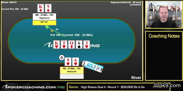 Hellmuth有一手明显的高胜率边缘成手牌,因此他不应该加注,导致他的牌被逐出底池。在我看来,这是一个极明显的跟注,而且PIO Solver也赞成(PIO Solver会在62%的时候跟注)。河牌3♥给了Hellmuth一副同花,现在轮到丹牛行动。如果你是他,你会怎么做?你check?下小注(比如6000)?下中注(比如12000)?下大注(比如19000)?这是一个我认为丹牛应该check的场合。河牌圈的3♥对丹牛不利,因为Hellmuth很可能放弃他的包括一张Q或10的边缘成手牌。如果丹牛下注,他应该使用一个较小尺度。