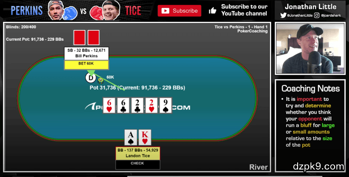 河牌是9♠,Tice过牌(check),Perkins往31736美元的底池全压60000美元。Tice在这种场合应该怎么做?是跟注54929美元还是弃牌?